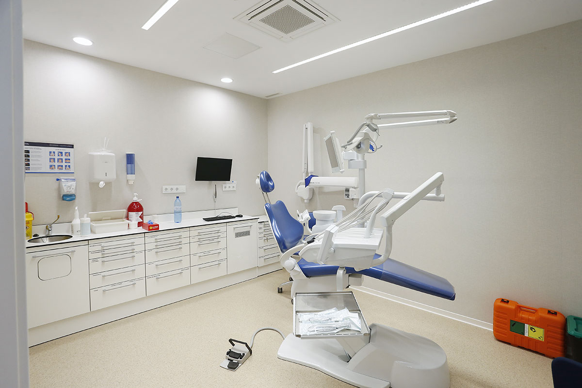 Área Dental: Acceso y recepción independientes, sala de espera, 4 gabinetes, 1 Ortopantomamógrafo, una sala de esterilización, un cuarto de motores, almacén, un despacho, un aseo y comunicación con el resto del centro para usar servicios comunes (entre ellos el aseo accesible).